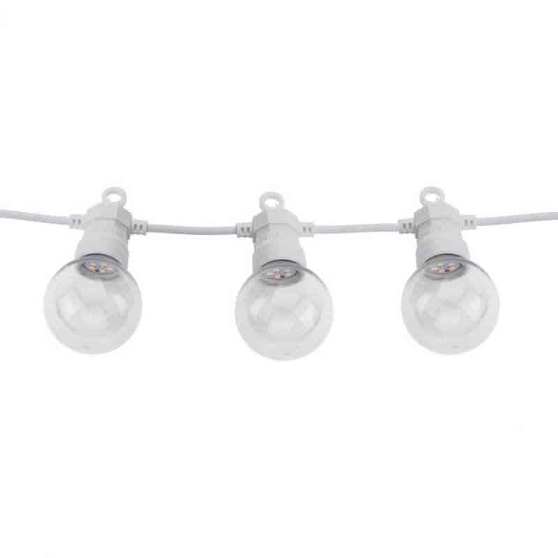 Iluminação suspensa para utilizar na decoração de ambientes no exterior. Desse modo, é um fio de luzes branco equipado com lâmpadas fixas em plástico transparente, apto para suportar a chuva, o sol e as poeiras normais numa utilização exterior. Isto, é são lâmpadas para pendurar na rua.
