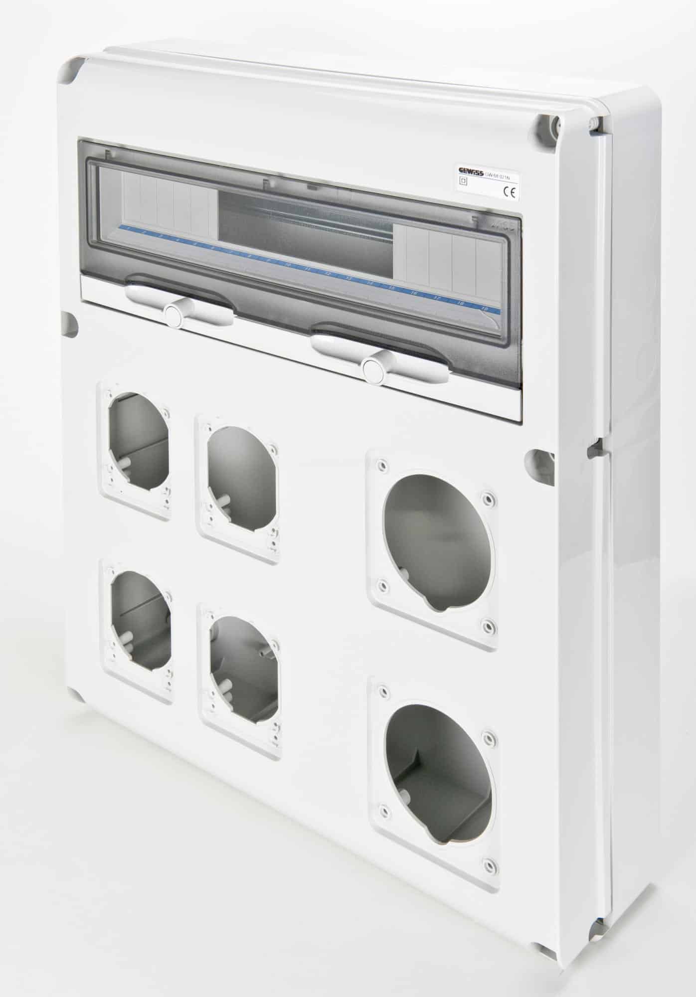 Os quadros de distribuição elétrica permitem alojar tomadas de encastrar interligadas até 63A. Além disso, tem várias versões disponíveis com 5, 10, 14 ou 20 módulos DIN e módulos adicionais de 14 e 20 DIN módulos para aumentar o espaço modular dentro das placas.