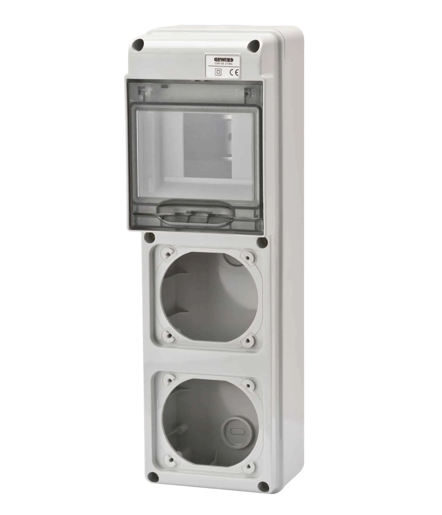 Os quadros de distribuição permitem alojar tomadas de encastrar interligadas até 63A. Além disso, tem várias versões disponíveis com 5, 10, 14 ou 20 módulos DIN e módulos adicionais de 14 e 20 DIN módulos para aumentar o espaço modular dentro das placas. Dessa forma, os interruptores podem ser inspecionados graças à porta transparente com puxador ergonómico. Pois, os parafusos “articulados” na frente do quadro facilitam a passagem do fio elétrico e a sua manutenção.